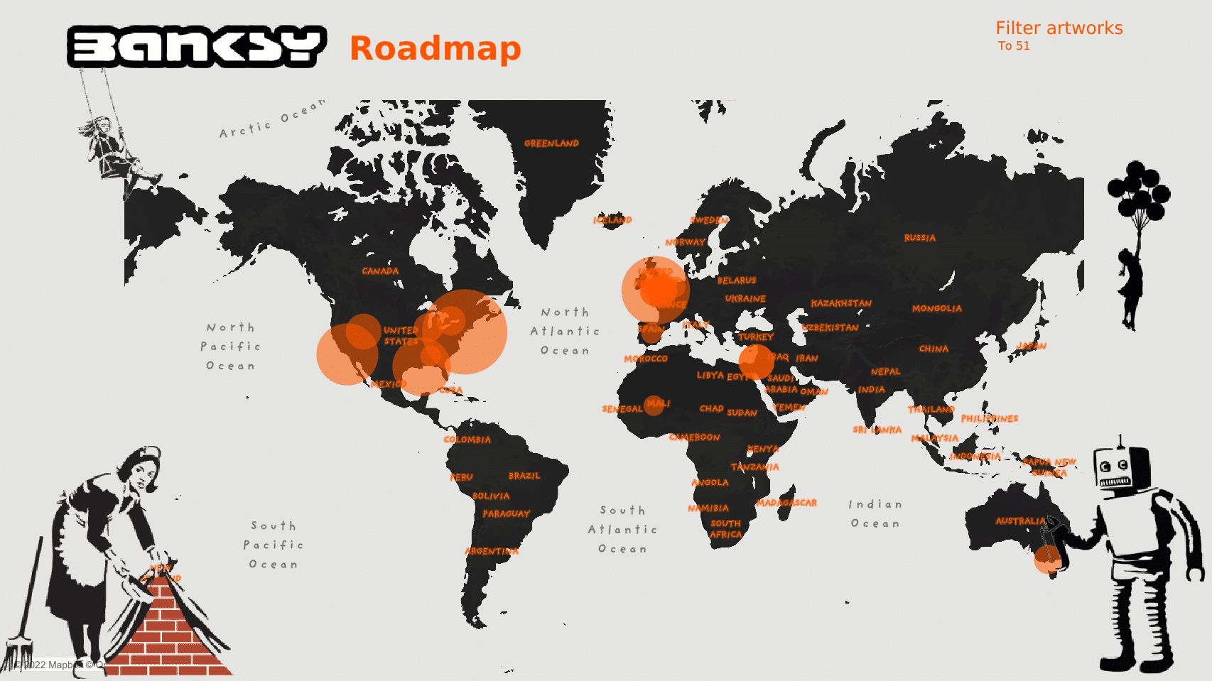 Isn’t this cool! An interactive Tableau dashboard showing the locations of each Banksy artwork. I especially love two elements of this. One is the branding. The dashboard look and feel compliments the topic perfectly. It almost looks like graffiti art itself. A key point I address in our data visualization workshops is to only add stylistic elements (animation, images, a stylistic typography) if it is in context with the visual topic. Try to avoid adding something just because it looks “cool”. The second element is the map, (of course!). I love the style but mainly want to point out how it basically sits alone on the dashboard. The designer/developer could have easily added multiple other charts to this dashboard but chose to let the map sit alone and have the real estate it demands and deserves. This dashboard is beautiful in its simplicity and functionality. Click on a location and it will take you to a zoom in and show you a journey to visit each site.