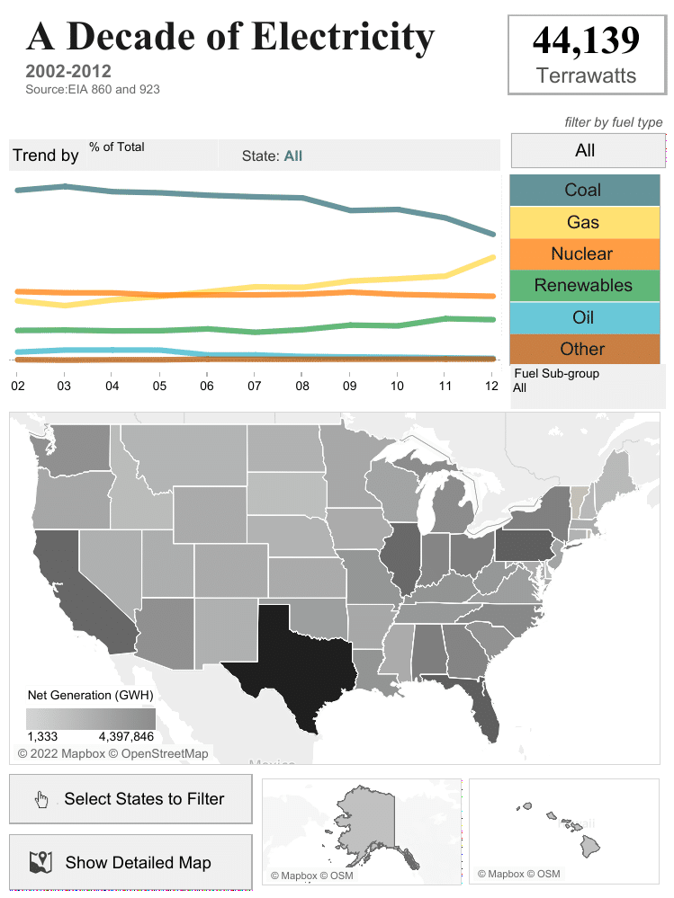 Of all the Tableau dashboard examples we’ve seen, this interface stands out because of its simplicity. It allows users to explore how the power industry in the United States has changed over the past decade. Built by Robert Rouse with Tableau, it draws on EIA energy generation data, filterable by fuel type and by state. It’s a great example of how Tableau can help shed light on complex figures in a complex industry.
